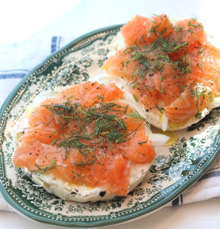 • ✅ 연어, 양파, 케이퍼 순으로 올리고 딜로 마무리